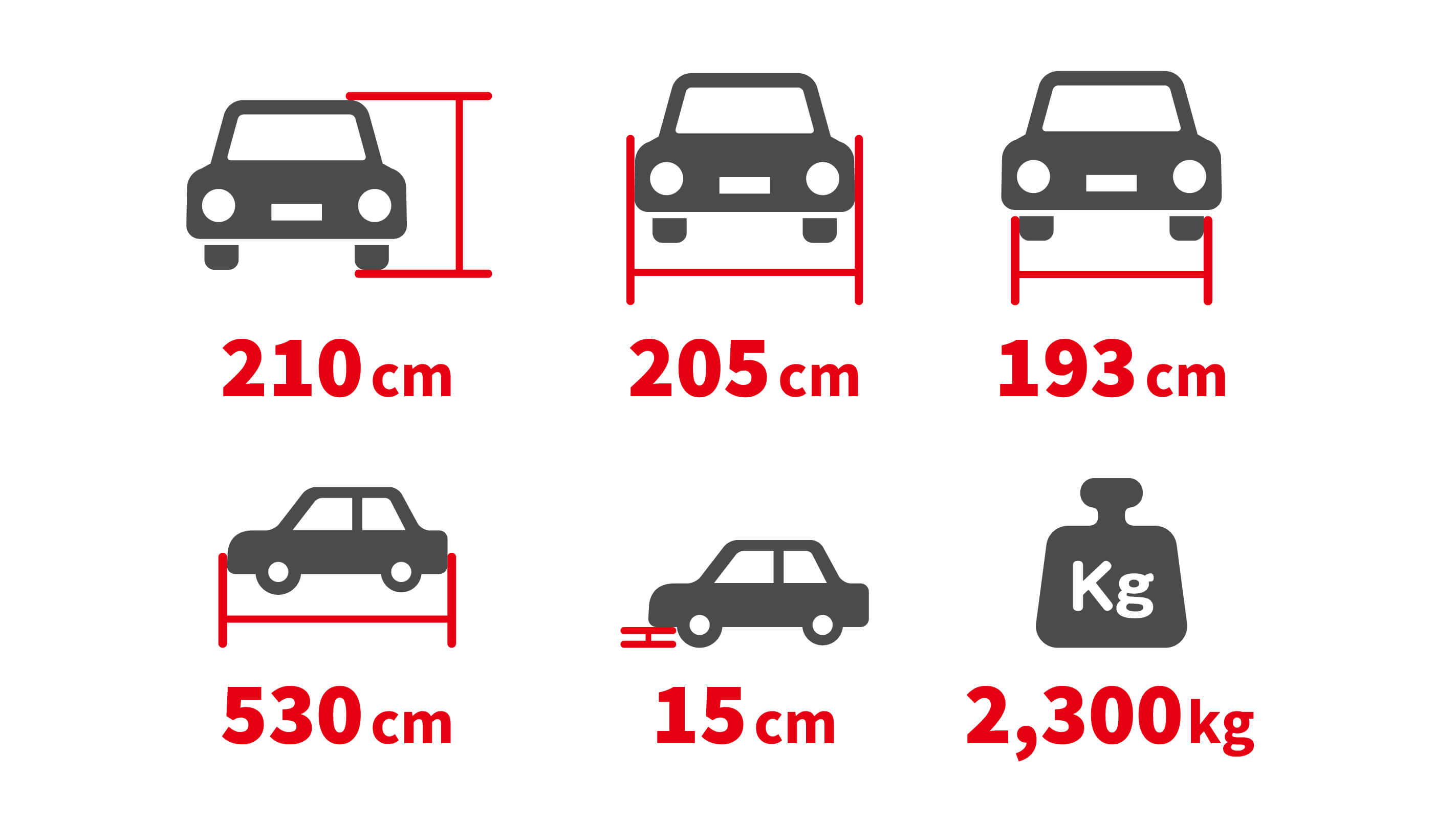 〈2・3号機:普通車〉長さ4.9m、幅1.85m、高さ1.6m、タイヤ外幅1.76m以下、重量1,700kgまで